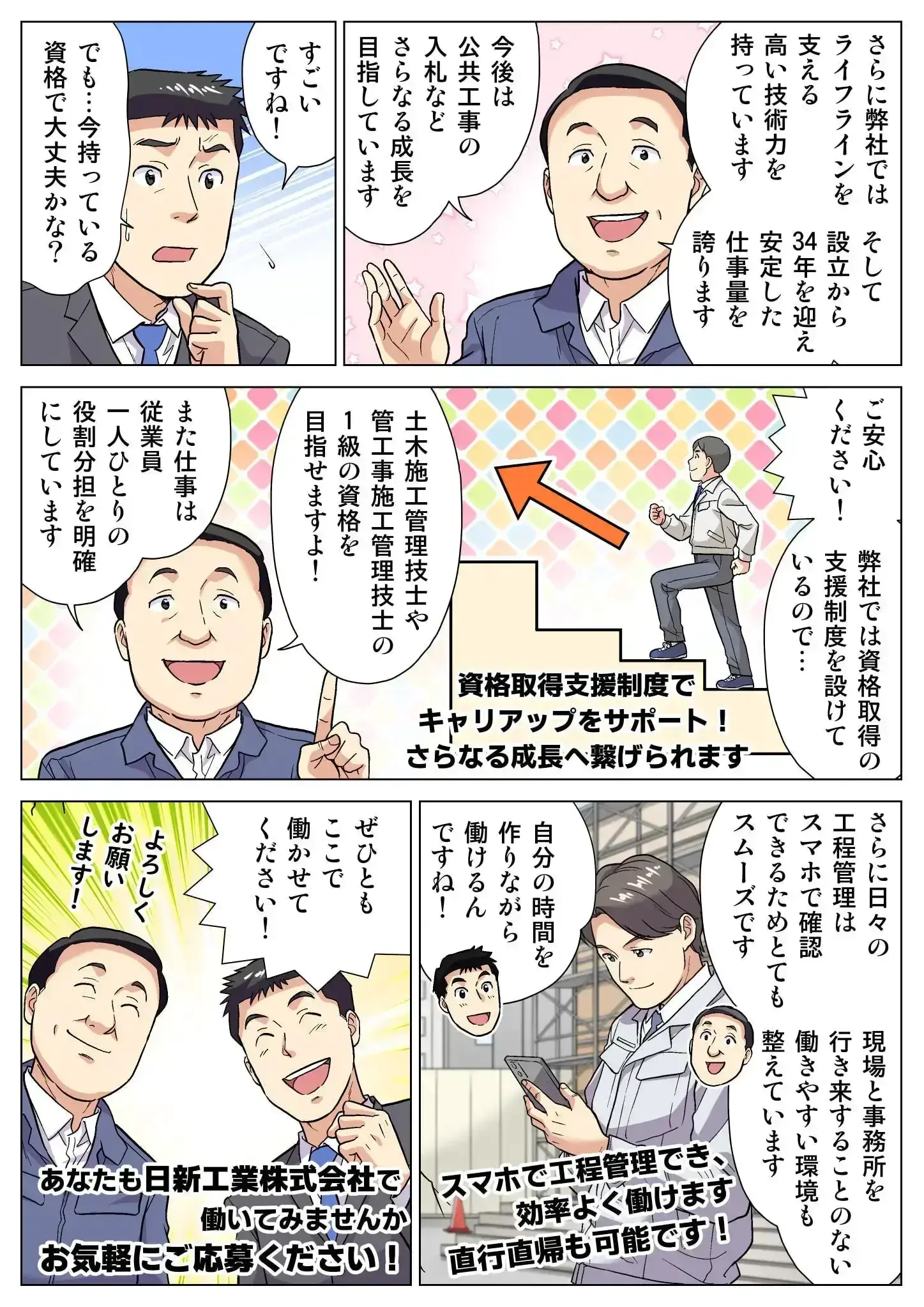 日新工業では現場経験を積んだ方を積極的に募集しています。豊富な経験を持つ方が即戦力として活躍できる環境を整えており、現場での実践を通じてさらなる成長を目指すことができます。日々の業務を通じてスキルを向上させ、プロフェッショナルとしてのキャリアを築いてください。